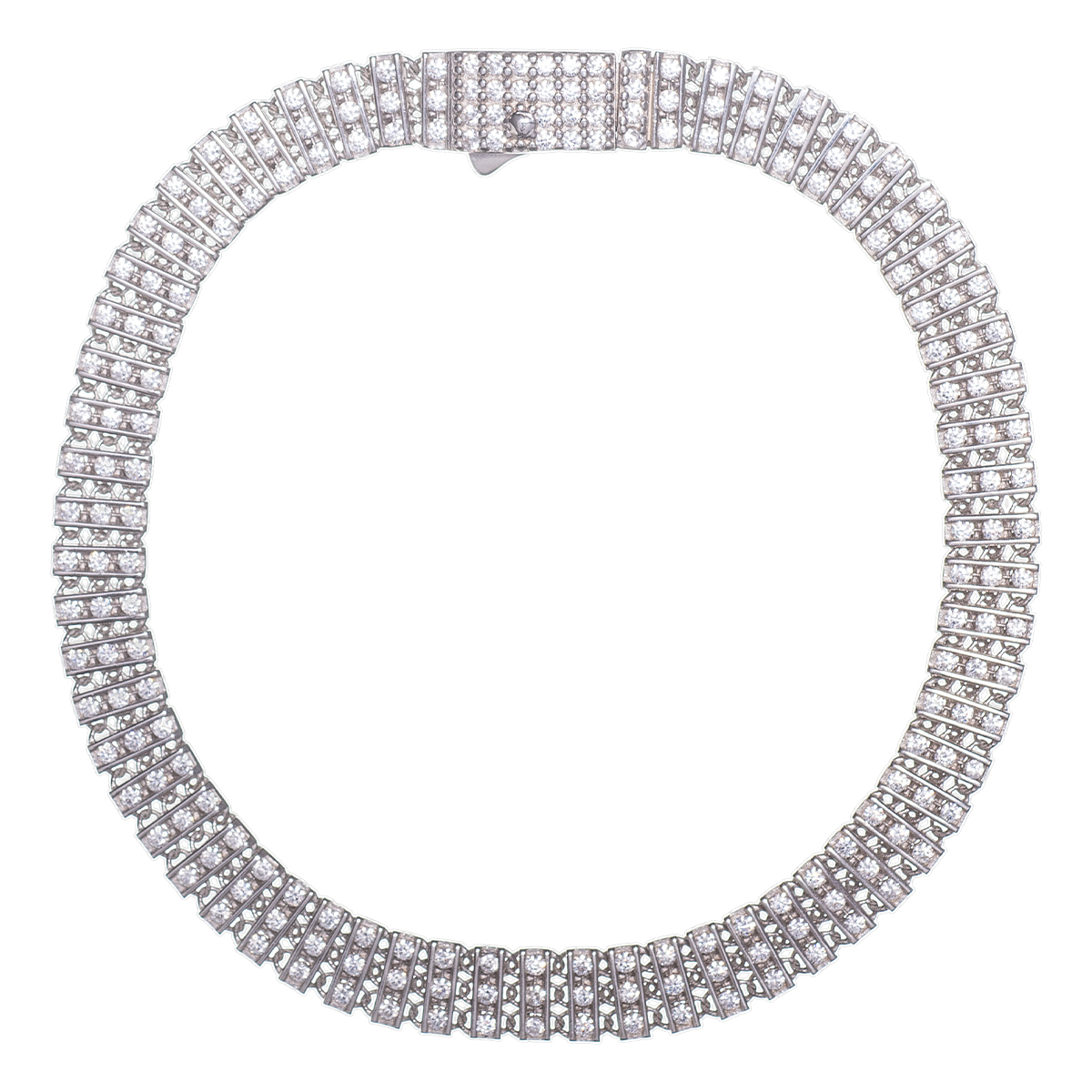Τριπλή σειρά συνδέσμων συνδέονται με παραλληλόγραμμες μπάρες οι οποίες είναι κοσμημένες με στρόγγυλα λαμπερά ζιργκόν τοποθετημένα συρταρωτά σε κανάλι, που του προσφέρουν μια υπέροχη αίσθηση πολυτέλειας και ιδιαίτερης ευκαμψίας. Η επιροδίωση (rhodium plating) χαρίζει έντονη λάμψη, αντοχή και ένα υψηλής ποιότητας φινίρισμα.