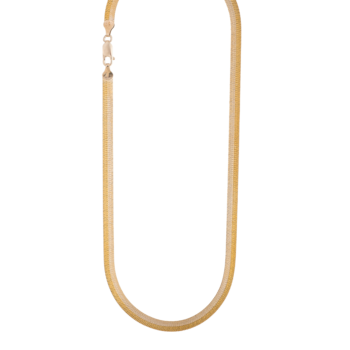 Θηλυκή και διαχρονική η αλυσίδα τύπου Snake-φίδι από ασήμι 925 έχει επιμετάλλωση χρυσού Κ18 και φαρδιά πλακέ επιφάνεια, πλάτους 5.5 mm. Το ιδιαίτερο χαρακτηριστικό της είναι η πολύ πυκνή ύφανση από επίπεδους συνδέσμους που σχηματίζουν ψαροκόκαλο-το σχήμα V.