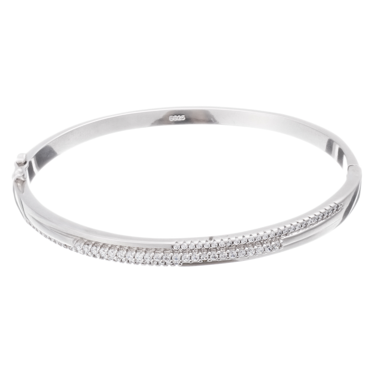 Χειροπέδα από επιροδιωμένο ασήμι 925 σε σχήμα αυγό με λουστρέ επιφάνεια κοσμημένη με ζιργκόν round κοπής τοποθετημένα σε 2 επίπεδα. Το βραχιόλι είναι ανοιγόμενο στη μέση, πλήρους βάρους για λεπτό καρπό, κλείνει με διπλό κούμπωμα ασφαλείας.