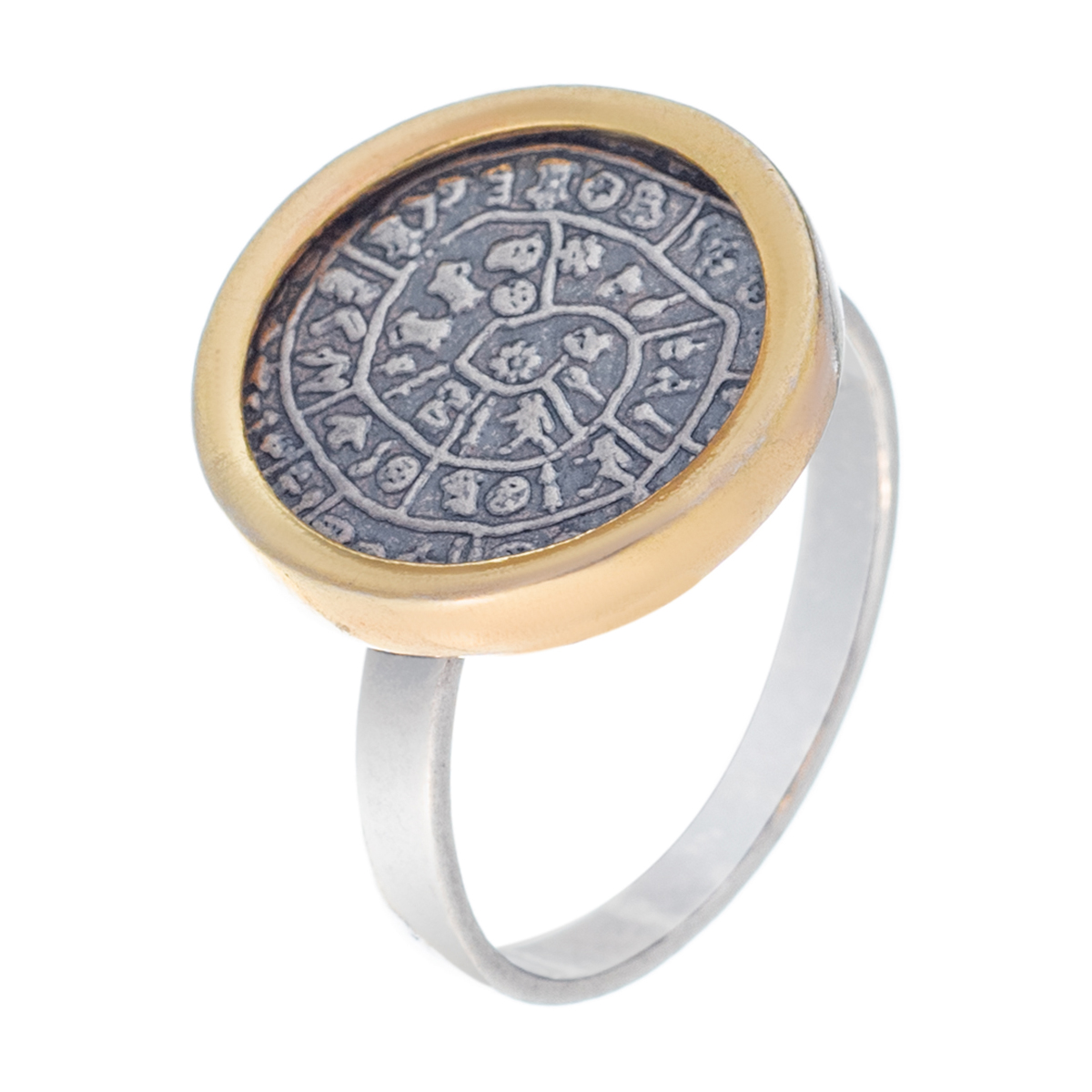 Δαχτυλίδι κατασκευασμένο από ασήμι 925 στην επιφάνεια του οποίου συνδυάζεται η οξείδωση με την επιμετάλλωση χρυσού Κ18, προσδίδοντας μοντέρνα και πολυτελή εμφάνιση. Στο κέντρο του υπάρχει ένα κυκλικό μοτίβο, με όψη νομίσματος, το οποίο αναπαριστά με εγχάρακτες λεπτομέρειες τον δίσκο της Φαιστού, ένα αρχαιολογικό κεραμικό εύρημα της Μινωικής περιόδου. Οι σκοτεινές αποχρώσεις της πατίνας στο κέντρο αναδεικνύουν το περίπλοκο σχέδιο.