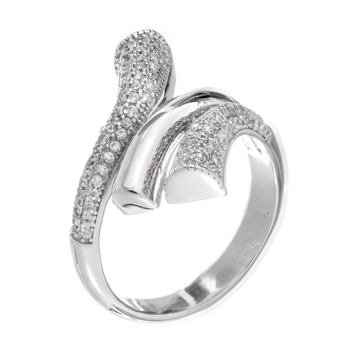 Δαχτυλίδι κατασκευασμένο από ασήμι 925 με επιμετάλλωση ροδίου. Η σχεδίαση του είναι minimal με σύγχρονη αισθητική, ενώ το χαρακτηρίζουν η φαρδιά λουστρέ επιφάνεια, οι συμμετρικές καμπύλες με κυρτές επιφάνειες και οι αντίθετες απολήξεις, με εντυπωσιακό αποτέλεσμα από την υψηλή διάθλαση, το οποίο τονίζεται από τον όγκο του και την κόσμηση των άκρων του από λαμπερά, πυκνά τοποθετημένα ζιργκόν.