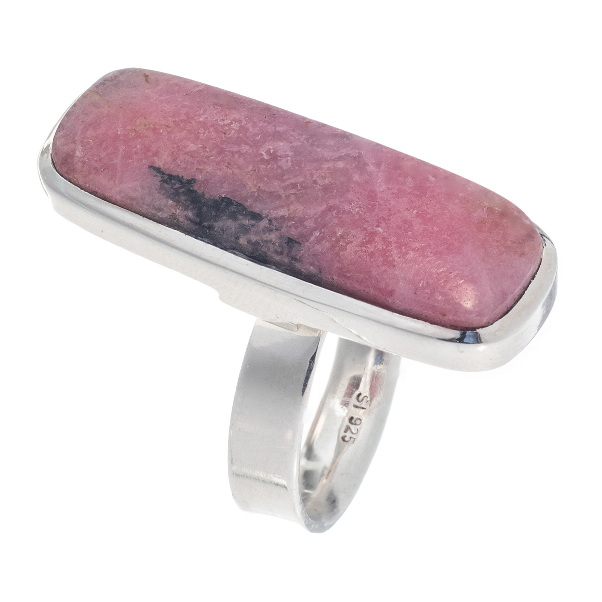 Το δαχτυλίδι είναι κατασκευασμένο από ασήμι 925 και διαθέτει έναν επιμήκη ημιπολύτιμο λίθο αχάτη που δίνει στο κόσμημα γοητεία και κολακεύει τα δάχτυλα, σε αποχρώσεις του ροζ με σκουρόχρωμες λεπτομέρειες. Το σχέδιο του είναι μοντέρνο και κομψό, ο λίθος σε καπουσόν κοπή.