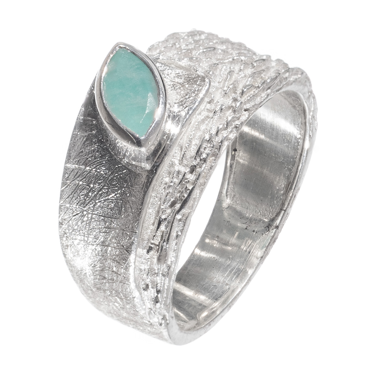 Στο κέντρο του δαχτυλιδιού δεσπόζει ημιπολύτιμος λίθος αμαζονίτη, σε κοπή “marquise”, η οποία έχει μπλε-πράσινη απόχρωση.