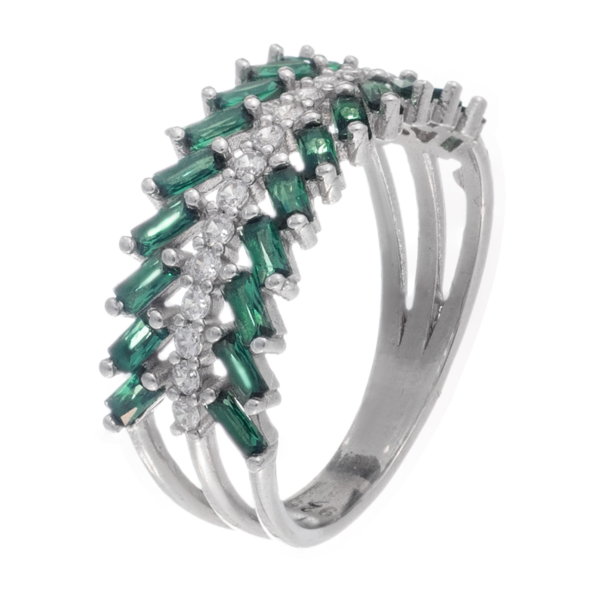 Eξαιρετικά κομψό δαχτυλίδι από ασήμι 925 με επίστρωση ροδίου, το οποίο προσφέρει λάμψη και προστασία. Η κύρια διακόσμησή του αποτελείται από πέτρες σε σμαραγδί απόχρωση με κοπή baguette, τοποθετημένες διαγώνια σε δύο γραμμές. Στη μέση αυτών, υπάρχει μια σειρά από διάφανες πέτρες ζιργκόν, που προσθέτουν λάμψη και ενισχύουν τον εντυπωσιακό χαρακτήρα του σχεδίου.