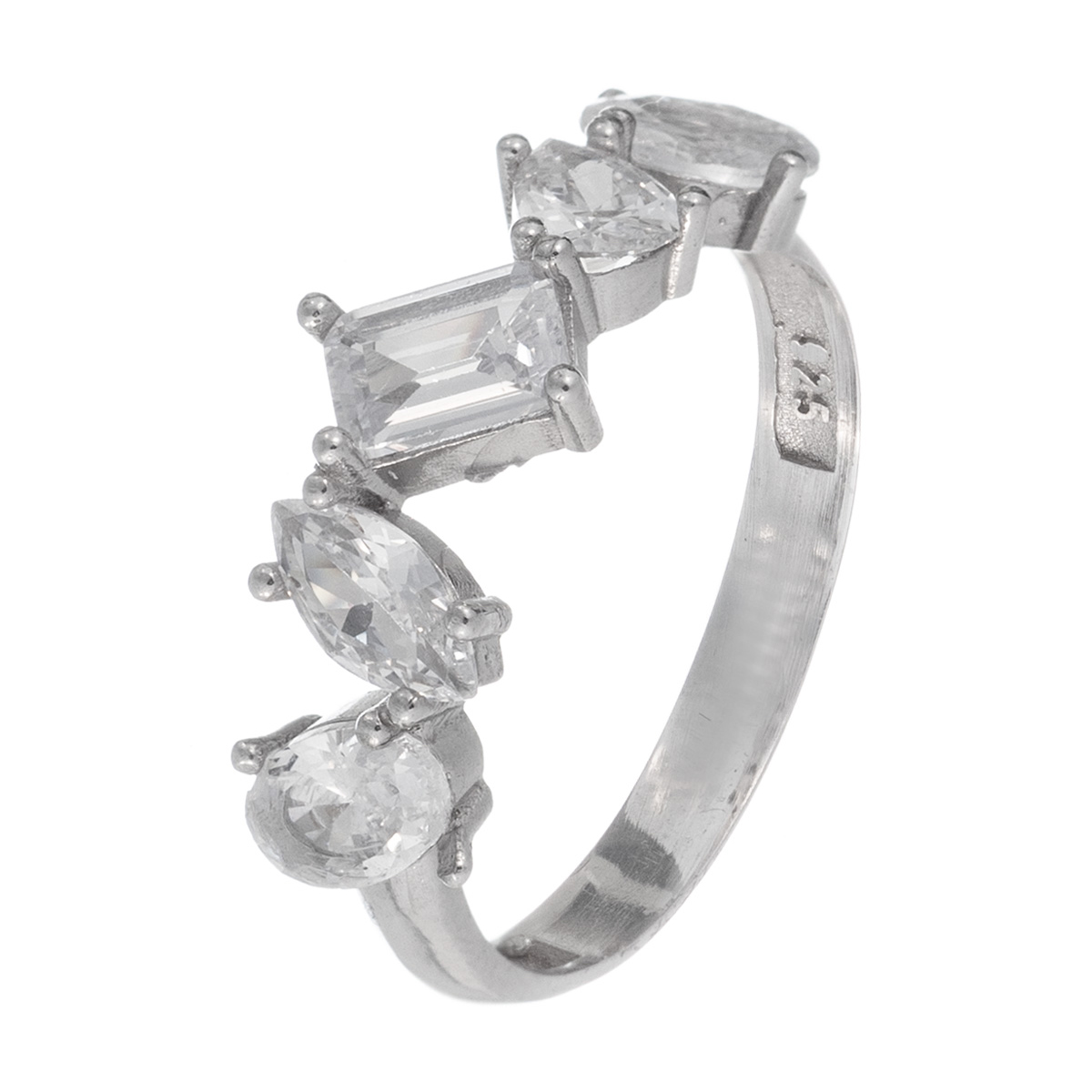 Δαχτυλίδι κατασκευασμένο από ασήμι 925, με επιροδίωση που του δίνει μια λαμπερή και ανθεκτική επιφάνεια. Το σχέδιο του χαρακτηρίζεται από μια κομψή διάταξη λίθων ζιρκονίας σε διαφορετικά κοψίματα, όπως pear, baguette και marquise, που προσθέτουν πολυδιάστατη λάμψη. Κάθε λίθος είναι προσεκτικά τοποθετημένος σε βάση με λεπτά στηρίγματα, εξασφαλίζοντας σταθερότητα και κομψότητα.