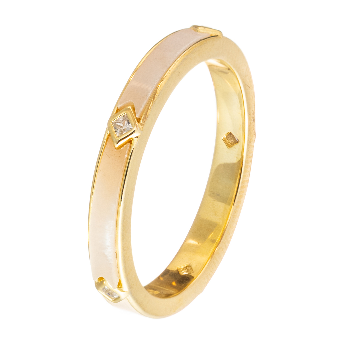 Δαχτυλίδι ολόβερο από ασήμι 925 με επιμετάλλωση χρυσού Κ18, που δίνει μια ζεστή και λαμπερή εμφάνιση. Ο σχεδιασμός του είναι λιτός και κομψός, με μια διακριτική έμφαση στη λεπτομέρεια. Ένα λαμπερό στοιχείο είναι οι μικρές τετράγωνες λεπτομέρειες, από διακοσμητικές πέτρες ζιργκόν, που τοποθετημένες συμμετρικά ακολουθούν την καμπύλη όψη του δαχτυλιδιού, η οποία έχει περίκλειστο μάργαρο – σεντέφι σε λευκό χρώμα, που του προσθέτει μια εκλεπτυσμένη και πολυτελή αισθητική.