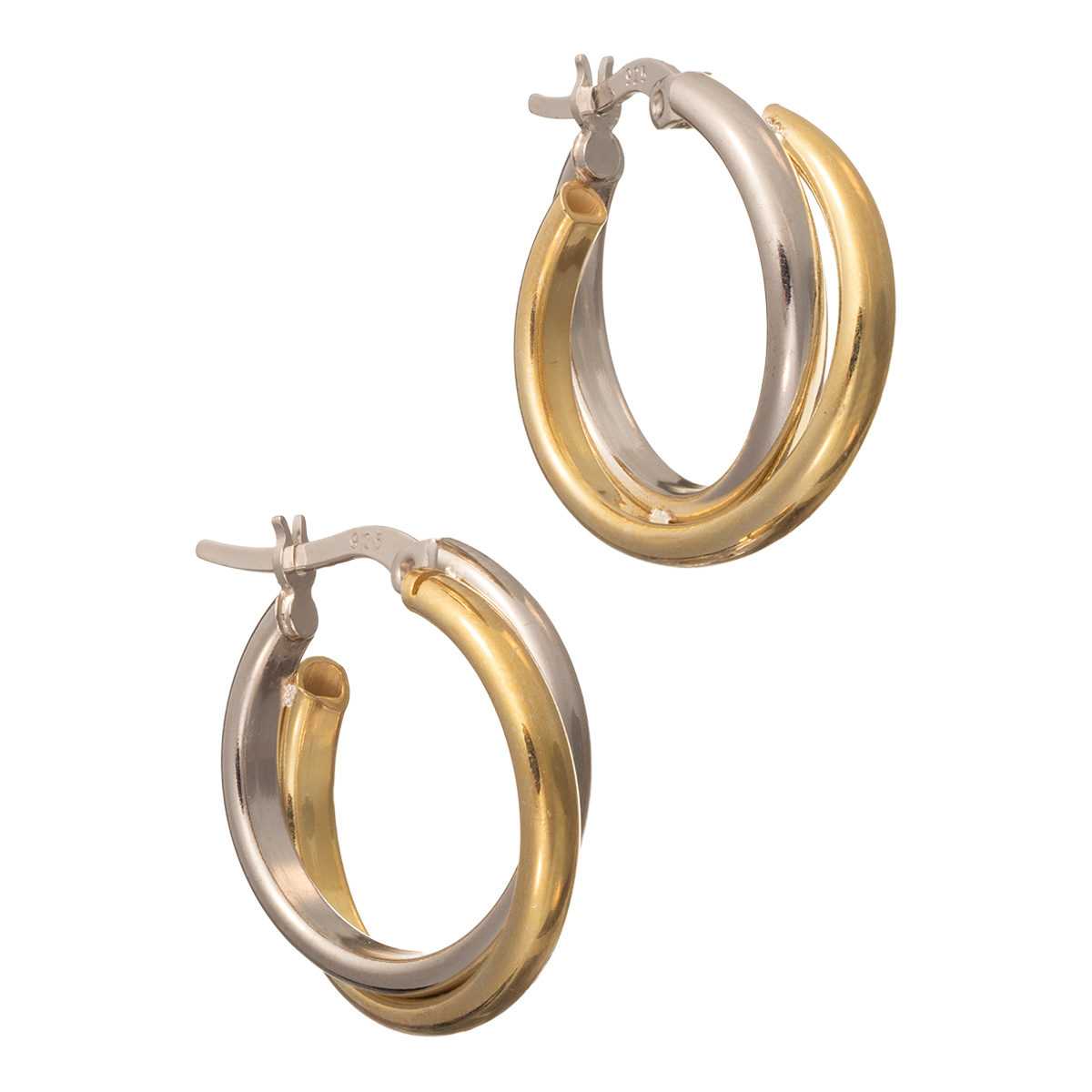 Σκουλαρίκια κρίκοι δίχρωμοι, κατασκευασμένοι από ασήμι 925 φινιρισμένοι με επιροδίωση και επιχρύσωση Κ18, σε μικρό μέγεθος. Είναι πλεγμένοι ελαφρώς μεταξύ τους σε ένα παιχνίδι αντιθέσεων.