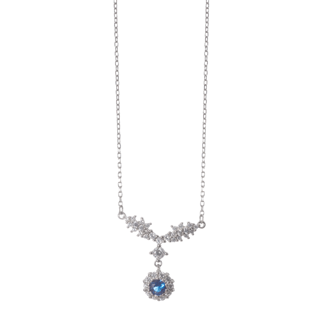 Κολιέ κατασκευασμένο από ασήμι 925 με επιμετάλλωση ροδίου από forzatina αλυσίδα η οποία στο κέντρο κατεβάζει μοτίφ ροζέτας με μπλέ ζιργκόν round κοπής ως κέντρο σε ένα πολύ εύκαμπτο και πλήρους βάρους σύνολο.