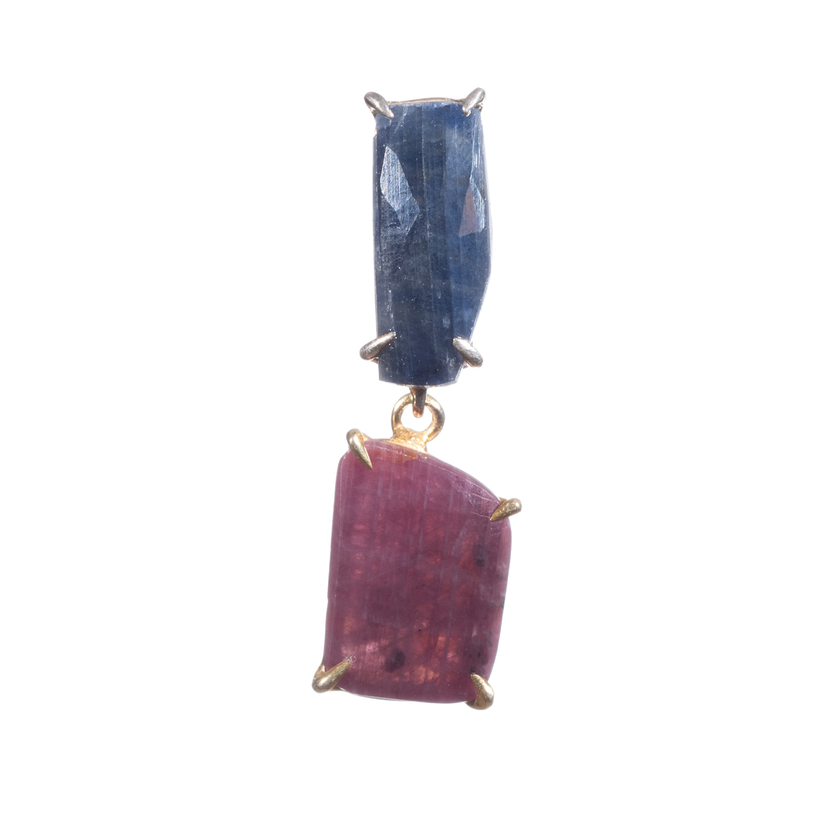 Μενταγιόν με μπλε αχάτη ημιπολύτιμο λίθο δεμένο χειροποίητα από ασήμι 925 με επιμετάλλωση ροδίου και γρανάτη σε κόκκινο βαθύ χρώμα ο οποίος αιωρείται και είναι δουλεμένος με ασήμι 925 με επιμετάλλωση χρυσού Κ14. Και οι δύο πέτρες έχουν ακανόνιστο σχήμα αν και παραλληλόγραμμοι και γυαλιστερή επιφάνεια λόγω της πολυεδρικής κοπής τους η οποία δεν είναι ορατή στη φωτογραφία.