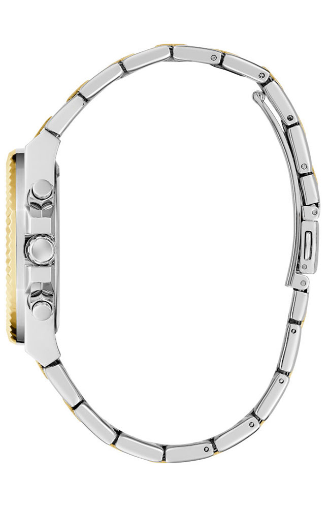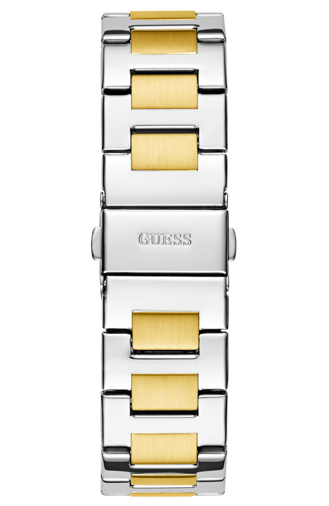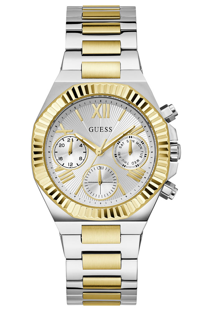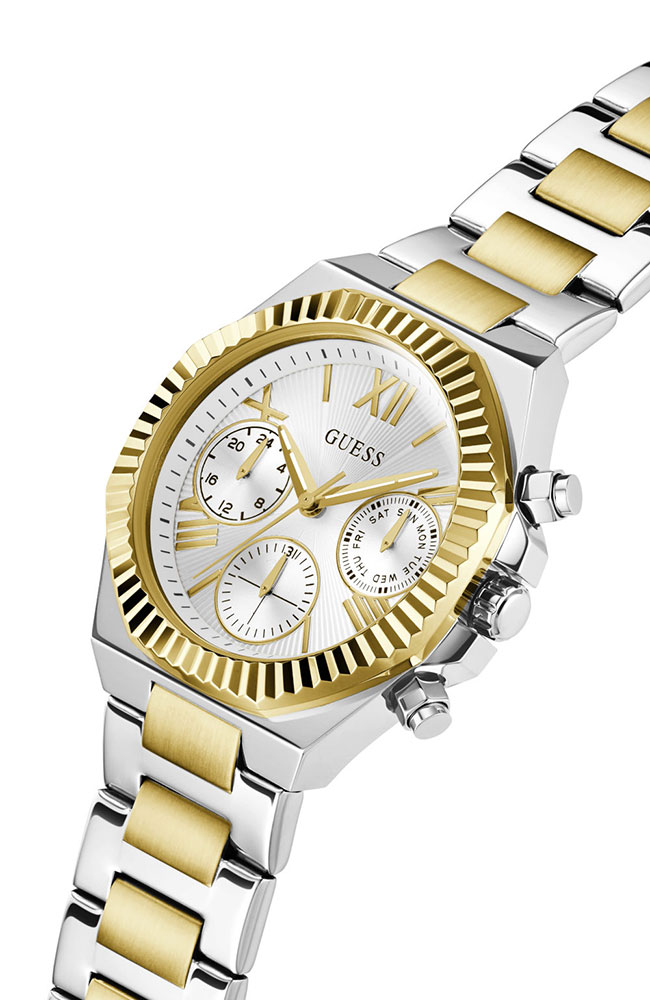 Ρολόι γυναικείο Guess Equality Multifunction Two Tone, κομψό και ανθεκτικό από ανοξείδωτο ατσάλι χρώματος ασημί/χρυσό και γυαλιστερό δίχρωμο μπρασελέ σε χρυσό/ασημί. Το ρολόι έχει ασημί καντράν με χρυσούς δείκτες και λατινικά στοιχεία. Αδιάβροχο στις 5 atm.