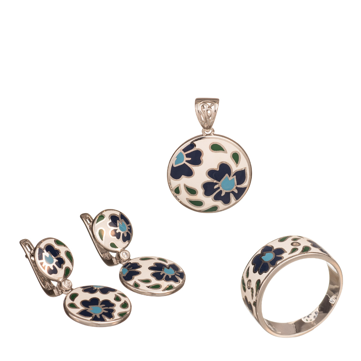 Τα κοσμήματα αυτού του υπέροχου σετ είναι κατασκευασμένα από ασήμι 925 με επιμετάλλωση ροδίου και χειροποίητο σμάλτο-enamel. Διαθέτουν ένα εντυπωσιακό floral μοτίβο εμπνευσμένο από την φύση. Ο σχεδιασμός τους περιλαμβάνει ολοζώντανα μπλε άνθη με τυρκουάζ λεπτομέρειες και λευκό  φόντο που δημιουργεί ιδιαίτερη αντίθεση με τα μπλε πέταλα των λουλουδιών.