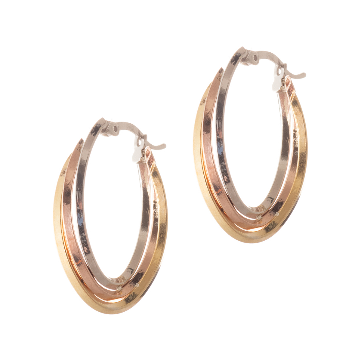 Σκουλαρίκια κρίκοι σε σχήμα δάκρυ-teardrops, φτιαγμένα από ασήμι 925, τρίχρωμο. H επιφάνεια τους διαθέτει τρεις ελαφρά, πλεγμένες λωρίδες μετάλλου σε τρείς διαφορετικούς χρωματικούς τόνους, χρυσό από επιχρύσωση, ροζ χρυσό και ασημί απο την επιροδίωση, χαρίζοντας ένα εντυπωσιακό εφέ σε ένα σχέδιο τολμήρο με γεωμετρικές αναφορές.