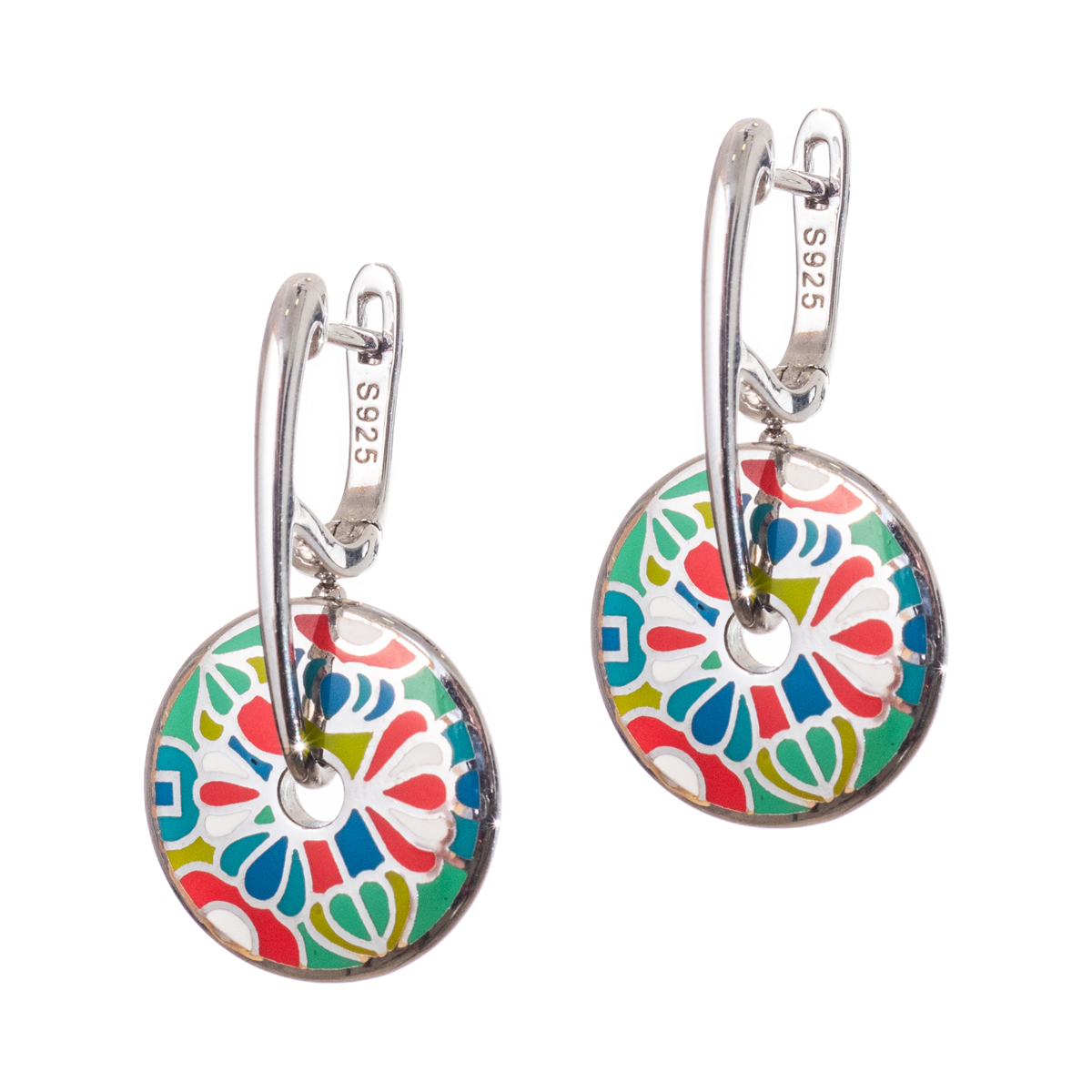 Σκουλαρίκια από ασήμι 925, με επιροδιωμένο φινίρισμα για επιπλέον λάμψη και ανθεκτικότητα. Έχουν κυκλικό σχήμα με ένα πολύχρωμο σχέδιο σμάλτου, που περιλαμβάνει αποχρώσεις του πράσινου, κόκκινου, μπλε και λευκού, το οποίο περιφέρεται ελεύθερα σε μακρύ κρίκο λουστρέ δημιουργώντας ένα όμορφο και ζωντανό μοτίβο. Το κούμπωμά τους είναι ασφαλές, τύπου English lock. Είναι εντυπωσιακά και ιδανικά για να προσθέσουν μια πινελιά χρώματος και κομψότητας σε κάθε εμφάνιση.
