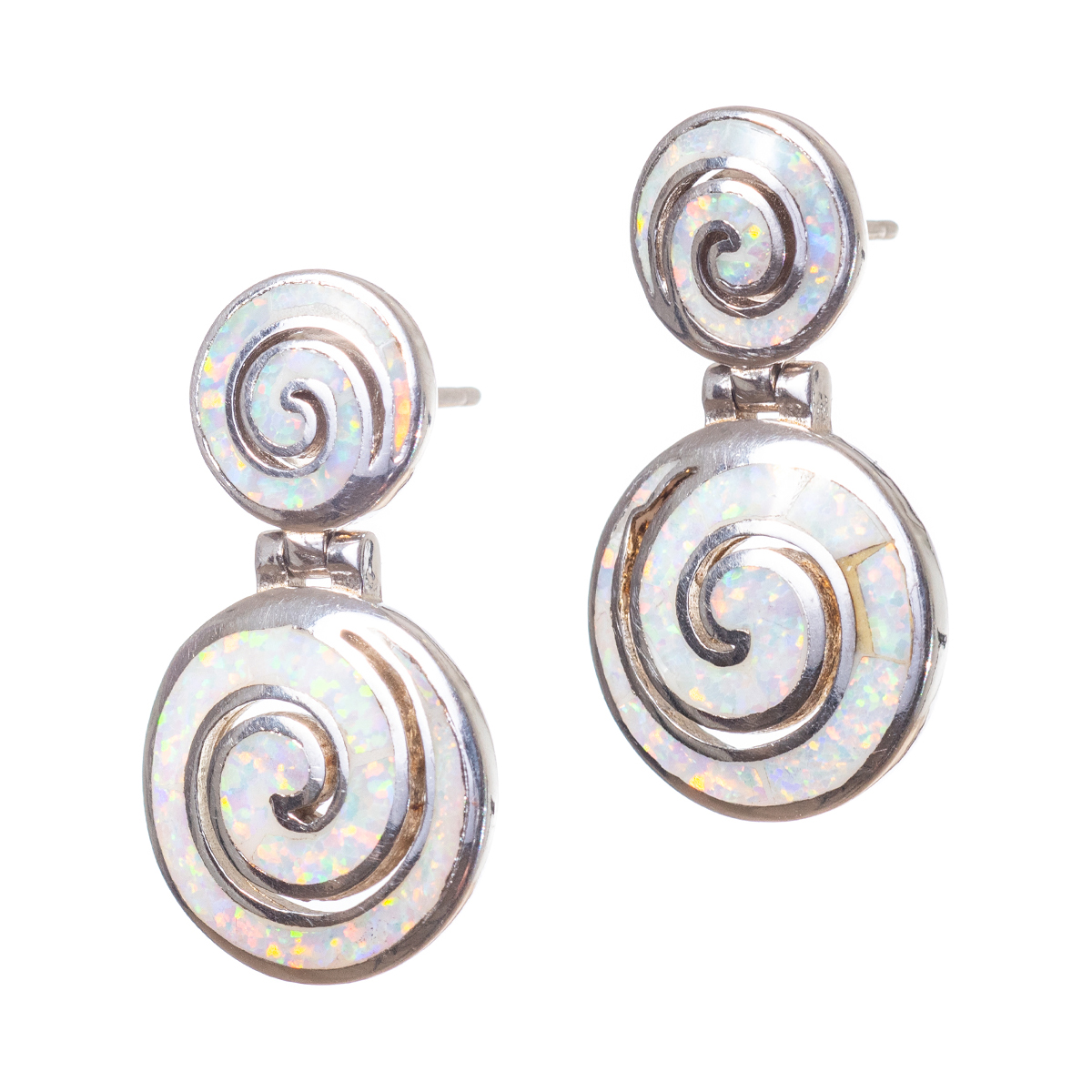 Αυτά τα σκουλαρίκια είναι κατασκευασμένα από ασήμι 925, το οποίο είναι γνωστό για την ποιότητα και την αντοχή του. Ο σχεδιασμός τους περιλαμβάνει δύο σπειροειδή μοτίβα σε κυκλικό σχήμα, το ένα πάνω από το άλλο,σύμβολα του κύκλου της ζωής, δημιουργώντας μια κομψή, γεωμετρική αισθητική. Η διακόσμηση περιλαμβάνει οπάλιο του οποίου τα ιριδίζοντα στοιχεία προσθέτουν χρωματικές αντανακλάσεις, δίνοντας έτσι μία μοναδική, ελαφρώς πολύχρωμη λάμψη.