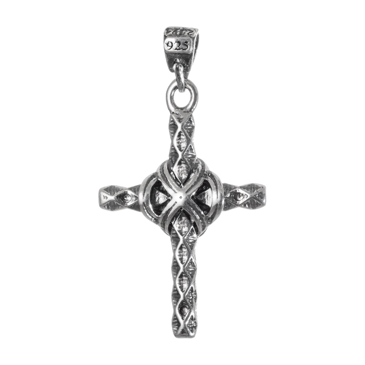 Ο σταυρός αυτός από ασήμι 925 έχει ένα εντυπωσιακό και περίτεχνο σχέδιο με κεντρικό στοιχείο που θυμίζει πλέγμα. Οι βραχίονες του σταυρού διαθέτουν ανάγλυφα το χριστιανικό συμβολο Χ σε σχέδια που φαίνονται σαν να “συστρέφονται” προς το κέντρο, προσδίδοντας του μια τρισδιάστατη όψη.