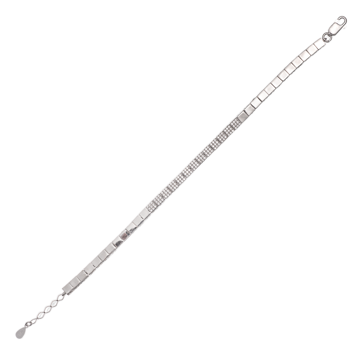 Βραχιόλι σε σχέδιο ριβιέρα-tennis braselle από ασήμι 925 επιροδωμένο με φαρδιά επιφάνεια. Η κομψή σχεδίαση του περιλαμβάνει στο κεντρικό του τμήμα τετράγωνα επαναλαμβανόμενα συνδετικά στοιχεία, κοσμημένα από τριπλή σειρά λευκών στρόγγυλων ζιργκόν, με παβέ τοποθέτηση (pave setting), ενώ καταλήγει σε τετράγωνους συνδέσμους με λουστρέ απαστράπτον φινίρισμα.