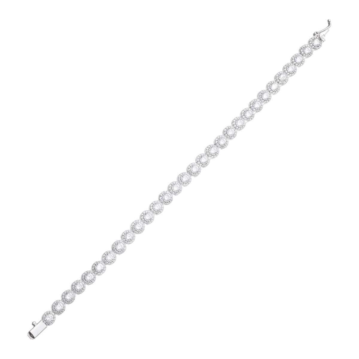 Βραχιόλι κατασκευασμένο από ασήμι 925 με φινίρισμα επιμετάλλωσης από ρόδιο αποτελούμενο από επαναλαμβανόμενα μοτίβα στο χαρακτηριστικό σχέδιο της ροζέτας-rosette. Η κεντρική του πέτρα από στρογγυλό διαυγή και λαμπερό ζιργκόν περιβάλλεται από μικρότερα επίσης round κοπής σε ένα σχήμα πού αναπαράγει το φυσικό λουλούδι τριαντάφυλλο.